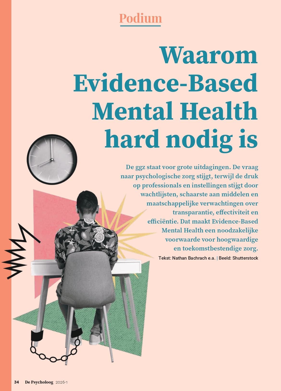 Het artikel Evidence-Based Mental Health in de opleiding tot GZ-psycholoog is geschreven door Nathan Bachrach, samen met Lars de Vroege, PhD, Robin van der Linde, Lieke Wijnhoven, Stijn Michielse, PhD, Marjan Drukker, Marij Gielen, Debbie Ceiler en Maarten Peters, en gepubliceerd in De Psycholoog 2026, nummer 1. De auteurs laten zien dat EBMH vaak wordt gereduceerd tot richtlijnen en effectstudies, terwijl het in de kern draait om het op gelijkwaardige wijze integreren van wetenschappelijke kennis, klinische expertise en ervaringskennis van de cliënt.